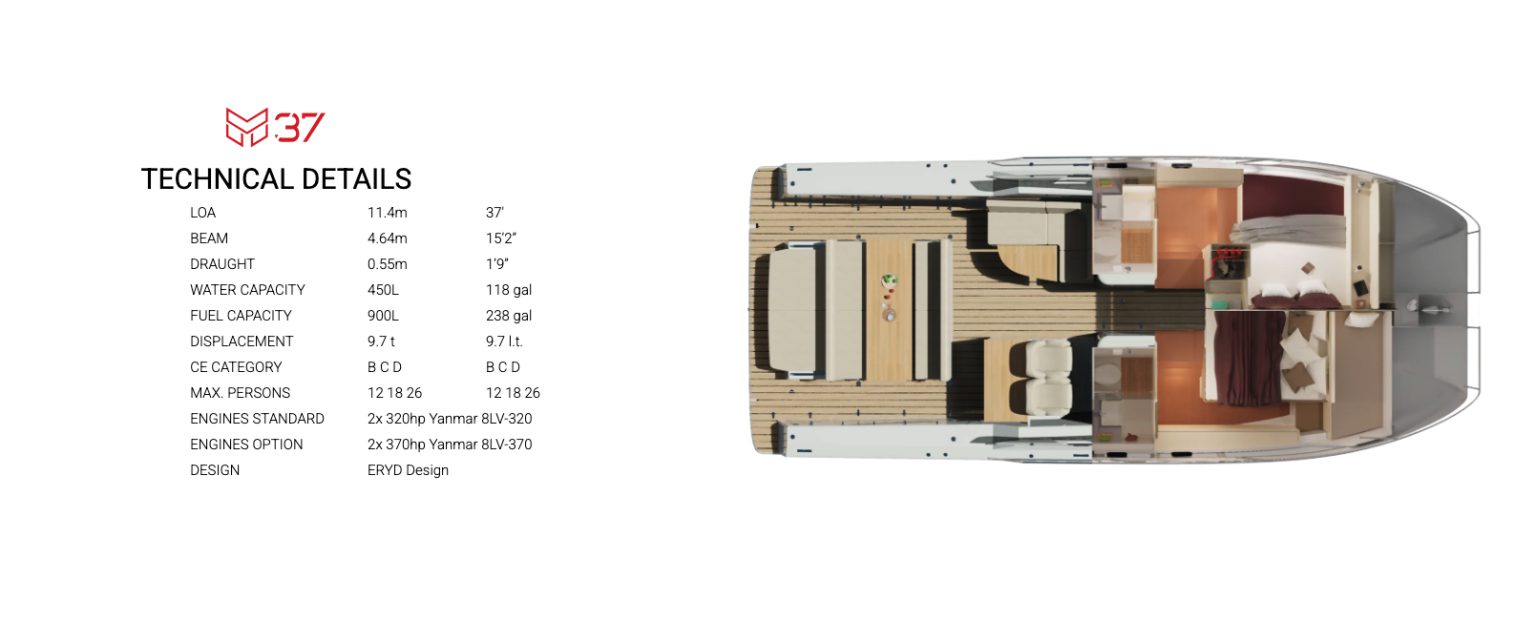 Measuring about 11.4 m (37 ft) with a broad 4.64 m (15’2”) beam, the M37 offers an unusually roomy interior for its class, including two large cabins each with en-suite heads and generous natural light and headroom typically found on much larger yachts. Its expansive cockpit comfortably seats up to 12 people, making it ideal for entertaining or family cruising.