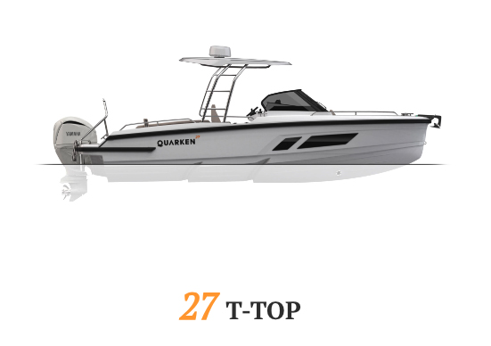 The Quarken 27 T-Top is a sporty and versatile 27-foot Nordic-designed day boat that blends performance, comfort, and practical use for coastal cruising and family outings. It uses the same efficient twin-stepped deep-vee hull as other Quarken 27 variants, giving confident handling, good stability in varied conditions, and a top speed around 44 knots with a typical Yamaha 300 hp outboard powerplant.