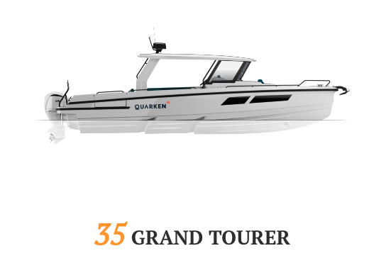 A standout feature is the spacious cockpit and deck layout: generous seating with comfortable sofas, a centrally located wet bar, and manually opening side terraces that expand usable space when at anchor. The enclosed forward cabin includes a large double berth, additional convertible sleeping space, and a dedicated bathroom with shower, making overnight trips practical and enjoyable. Built with vacuum‑infused GRP, the hull is strong yet relatively light, improving efficiency and durability. With room for up to 10 passengers, the 35 Grand Tourer is a refined choice for boaters who want both performance and comfort on longer excursions.