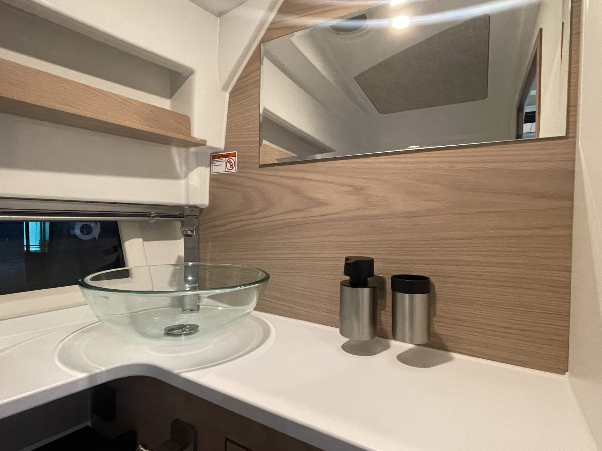 The centre point of the forward cabin is the cozy and comfortable large bed for two adults and a sofa that can be extended to a bed for children. The enclosed toilet compartment equipped with a sink and shower guarantees easy living onboard.